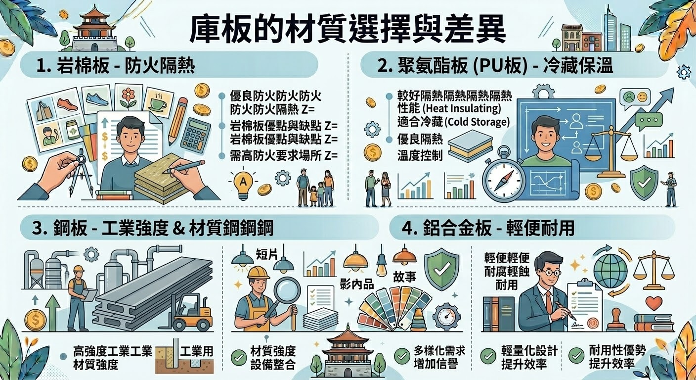 A:常見材質包括岩棉板、聚氨酯板、鋼板等,選擇時要根據空間需求、隔熱、防火與防潮要求來決定合適材質。