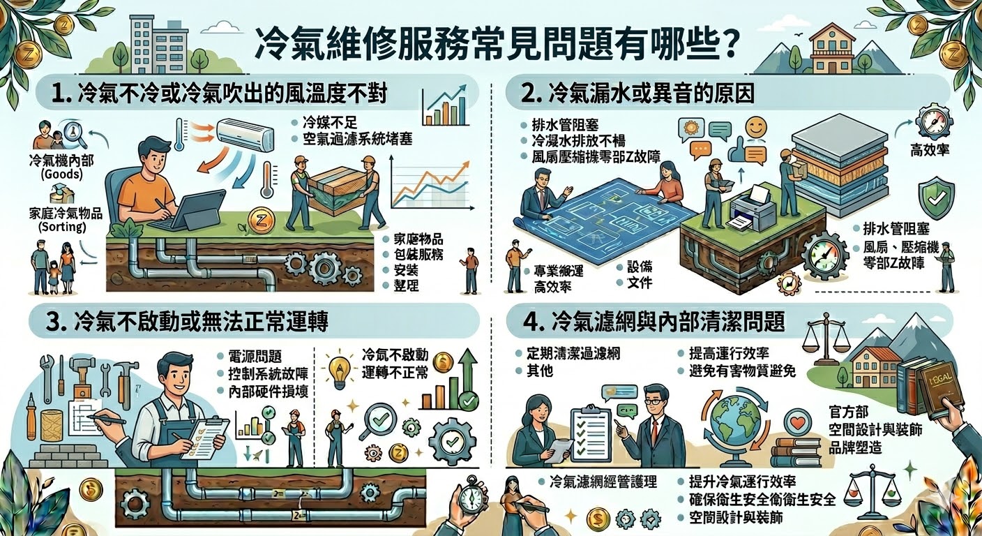 A:常見問題包括冷氣不冷、漏水、異音、無法啟動等,這些通常是冷氣使用一段時間後常見的故障,需要專業維修人員進行檢查與處理。