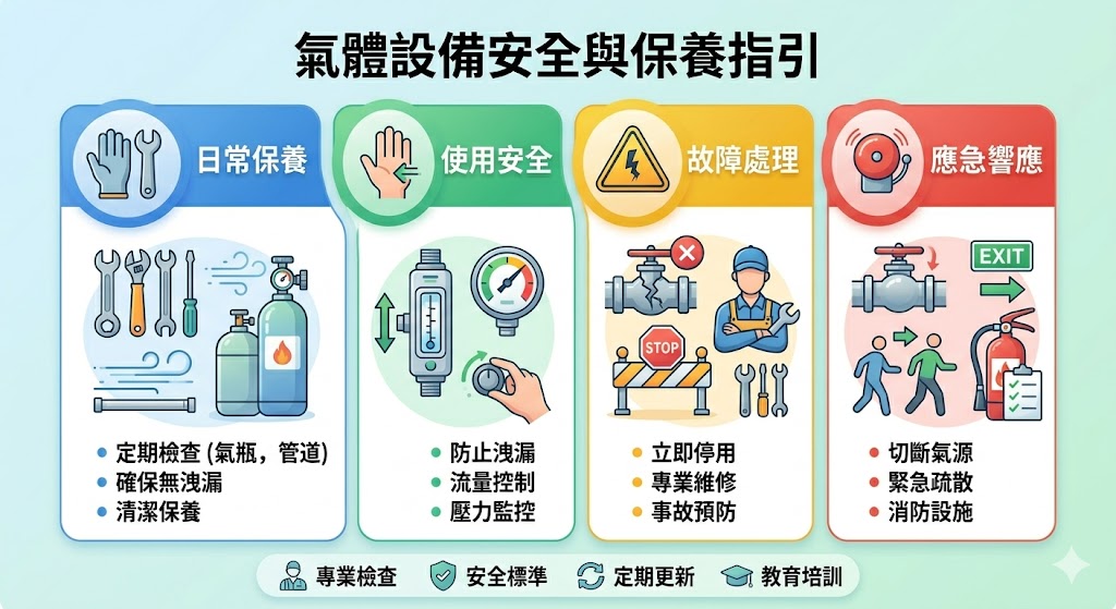 - 氣體設備的日常檢查與保養:定期檢查氣體設備,特別是氣瓶與管道,確保無泄漏且運行正常。設備應保持清潔並定期進行保養。