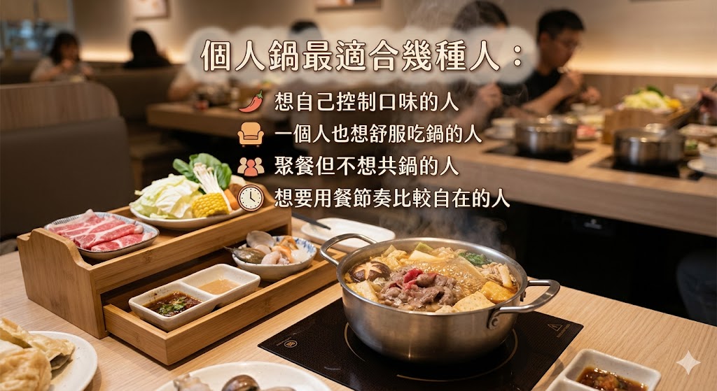 - 個人鍋:一人一鍋,口味獨立,適合自己吃或小型聚餐。