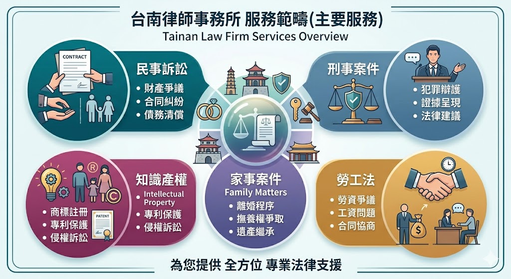 台南律師事務所是提供法律服務的專業機構,致力於解決各類法律問題,並且協助當事人維護其合法權益。這些服務涵蓋了民事、刑事、家事、商業等領域,並且提供訴訟、法律咨詢與其他法律協助。無論是訴訟或非訴訟案件,選擇合適的律師事務所能幫助您有效處理法律問題,確保合法利益不受損害。